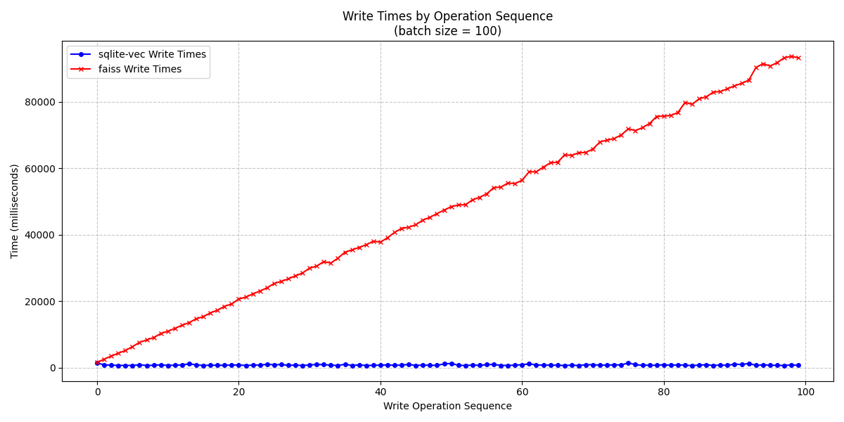 You will notice that the average write time for sqlite-vec was 788ms, compared to